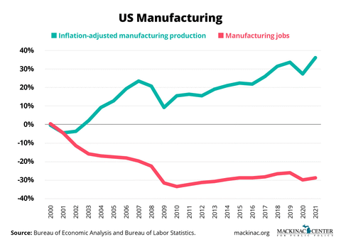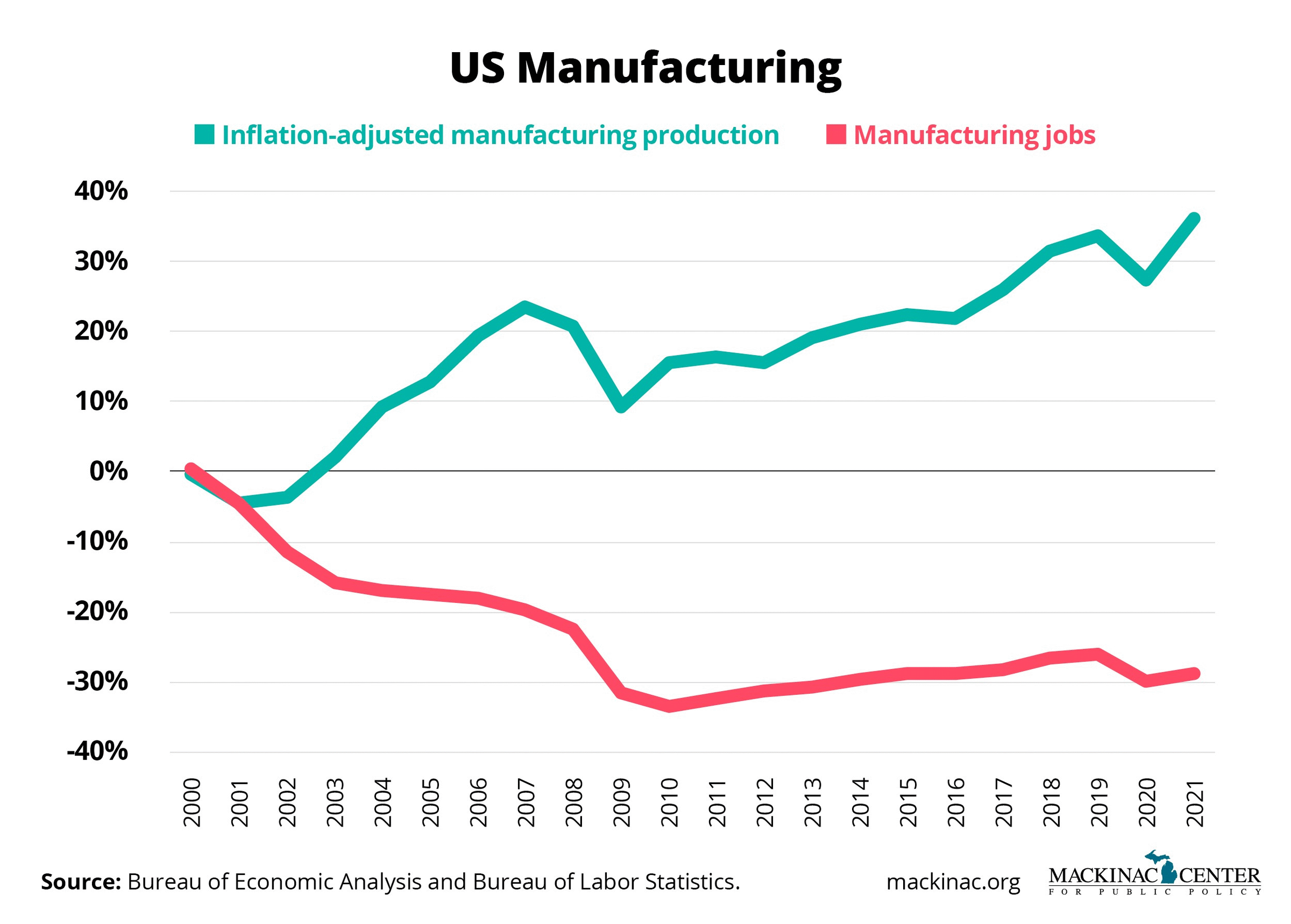 The value of manufacturing in the United States, as measured by inflation-adjusted GDP, has increased by about 37% since 2001, according to James Hohman, director of fiscal policy at the Mackinac Center. In that same period, the number of manufacturing jobs has dropped by almost 28%, Hohman said.