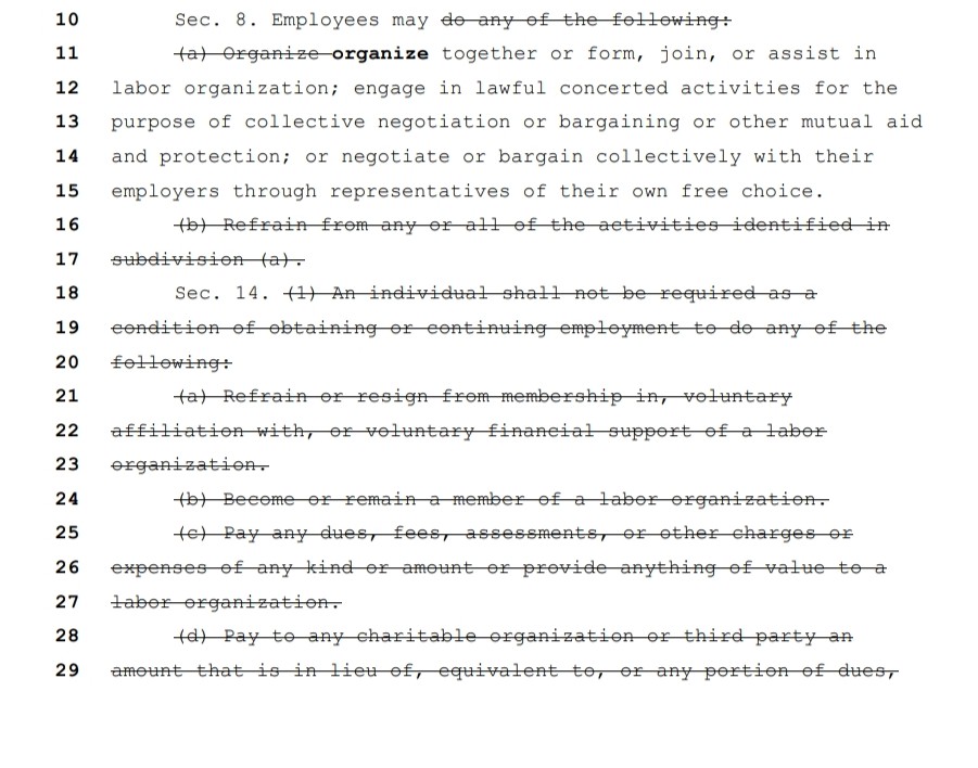 Page two of the seven-page bill shows what’s at stake if it were to pass. No longer would workers represented by private sector unions have the choice whether to opt out. The government would take that right away.