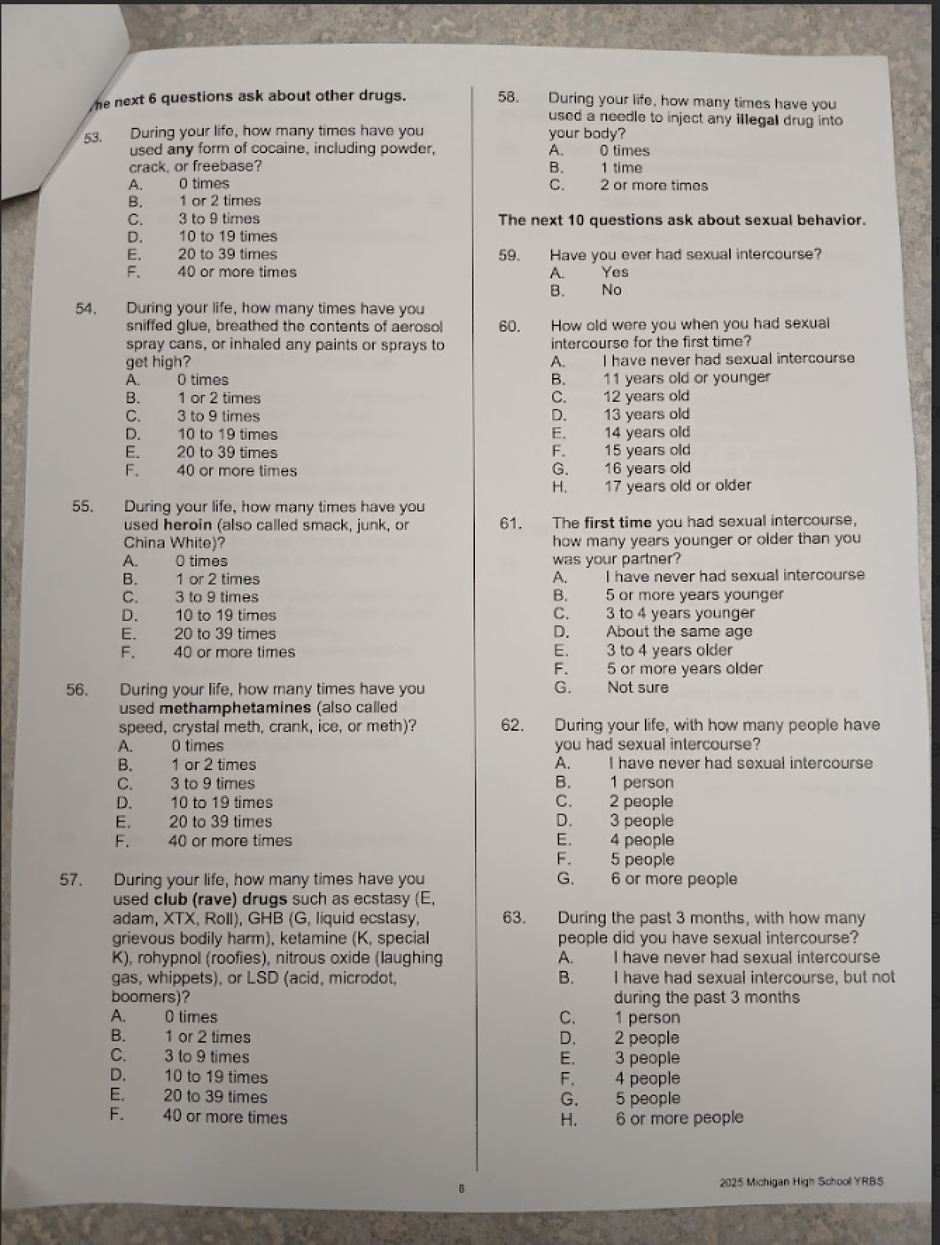 The 2025 Michigan High School Youth Risk Behavior Survey asked about students’ weight “without shoes,” alcohol and drug use, and their sexual history, which included the following questions: