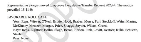 Legislative Transfer 2023-4 passed the House committee in an 18-11 vote Tuesday. The roll call vote is pictured below: