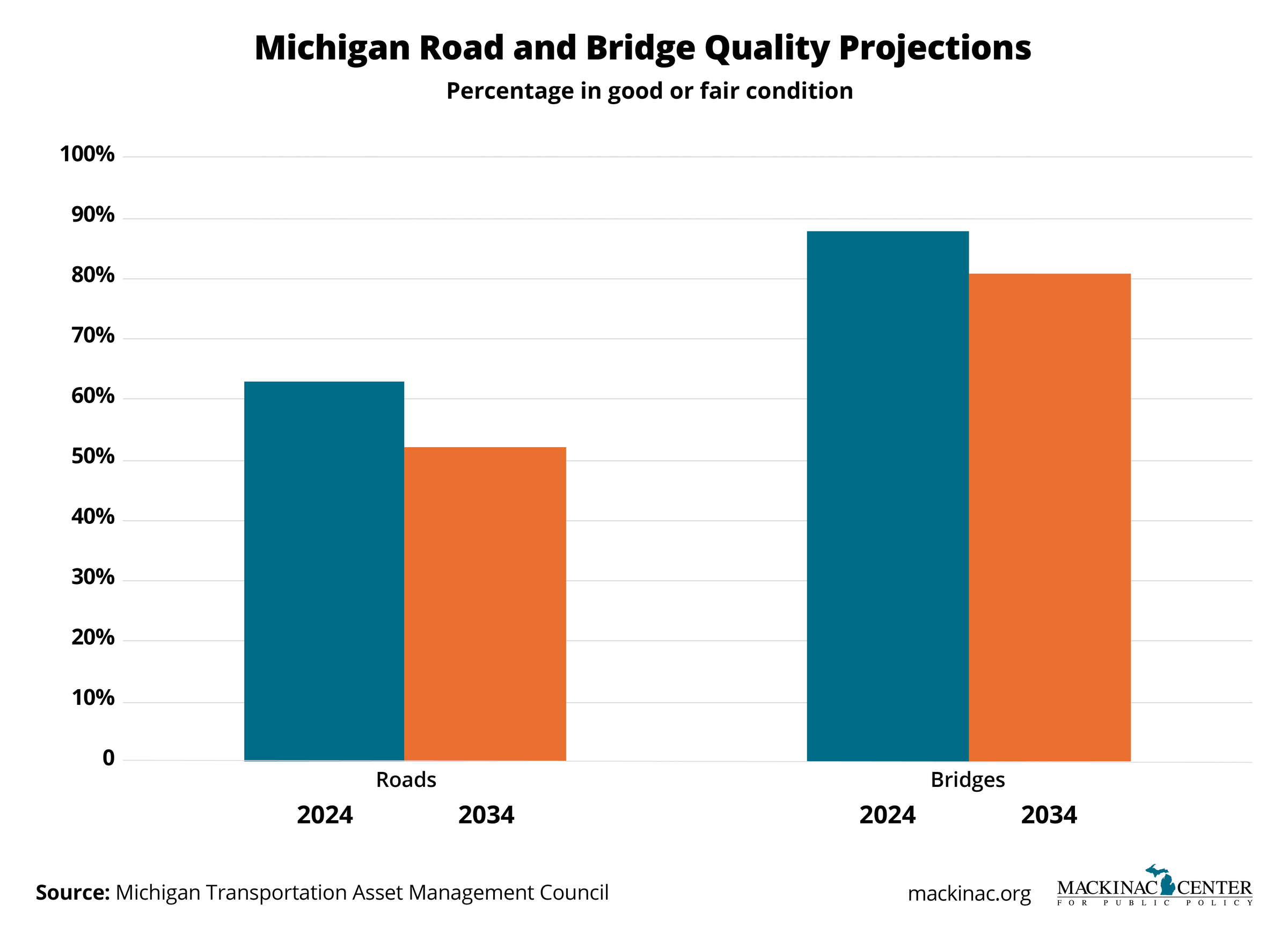 Nearly two-thirds of Michigan’s roads are in good or fair condition, according to the Transportation Asset Mangement Council, which estimates that 25% are in good condition and 38% are fair. The percentage of roads in good or fair condition will drop to 52% by 2034, however, with 20% in good condition and 32% only fair. Nearly half of all roads (48%) will be in poor condition.