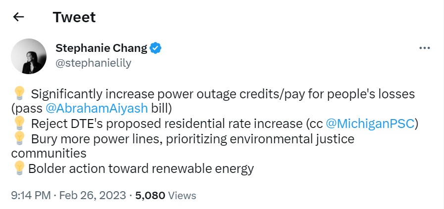 Chang said in a tweet that the Legislature should reject DTE’s proposed residential rate increase, and she retweeted calls for legislative hearings on the power outages.
