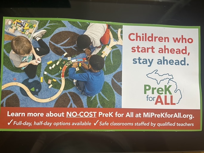 The flyer concludes with the statement “All Michigan four-year-olds can now qualify for no-cost, high-quality PreK.”