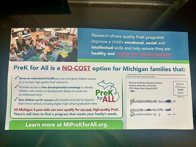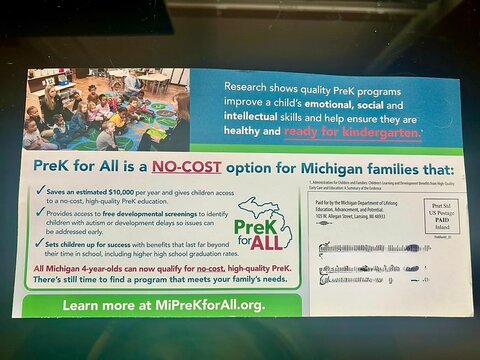 The state mass mailed flyers advertising: “Pre-k for All is a NO-COST option for Michigan families that: