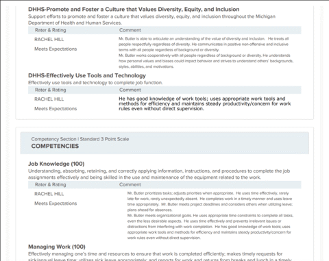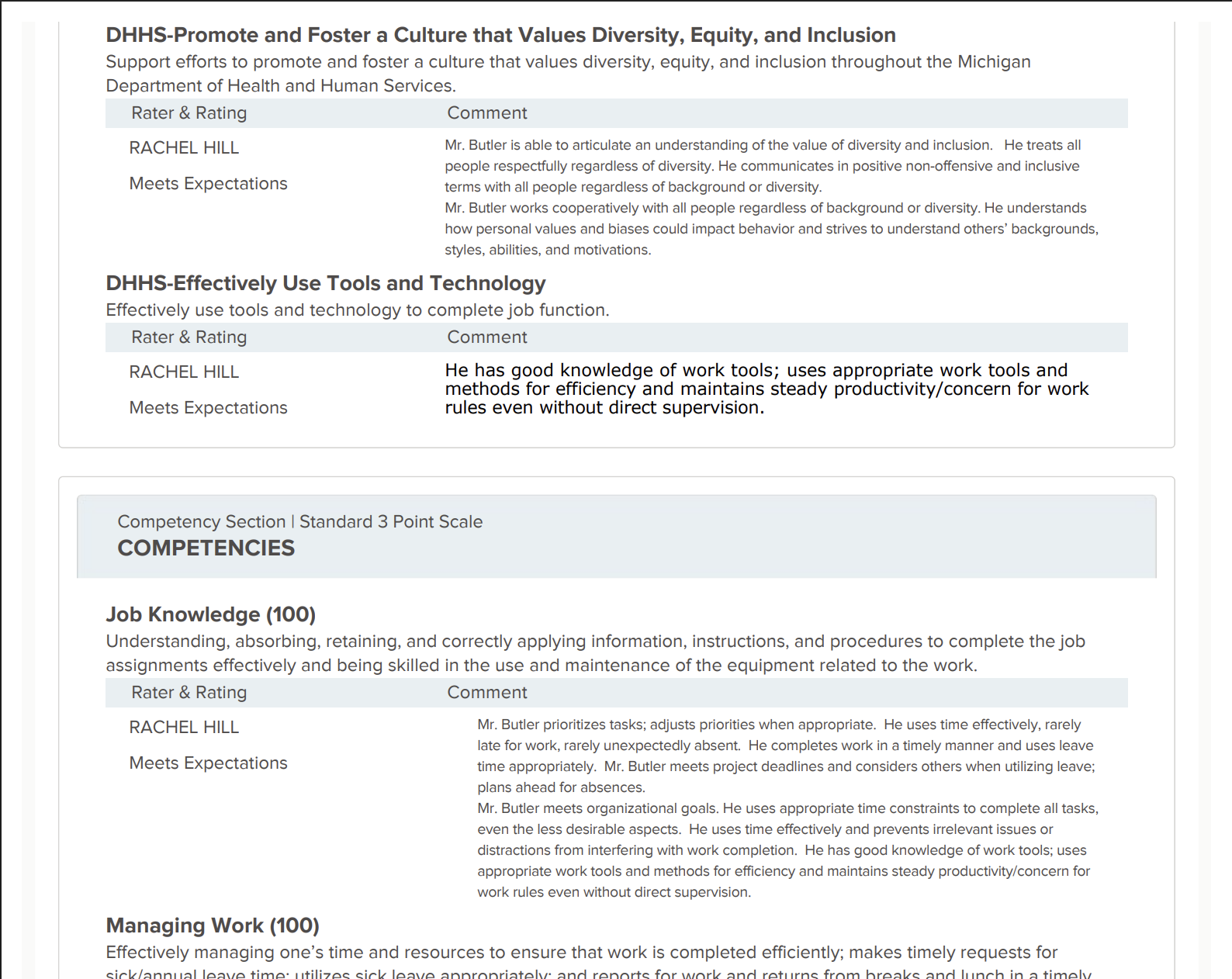 “Mr. Butler is able to articulate an understanding of the value of diversity and inclusion. He treats all people respectfully regardless of diversity. He communicates in positive non-offensive and inclusive terms with all people regardless of background or diversity. Mr. Butler works cooperatively with all people regardless of background or diversity. He understands how personal values and biases could impact behavior and strives to understand others’ backgrounds, styles, abilities, and motivations.”