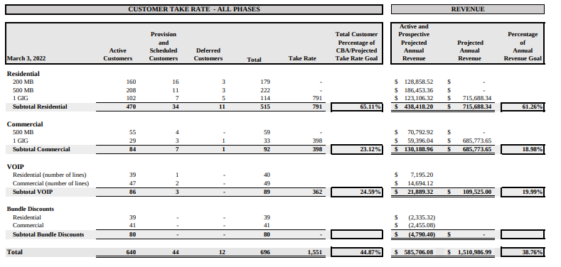 It didn’t happen. In its latest documents from March 2022, the government entity shows that it has only 640 active customers — residential and commercial — for internet, phone and bundled service. That’s less than half the number the city predicted would be needed to break even.