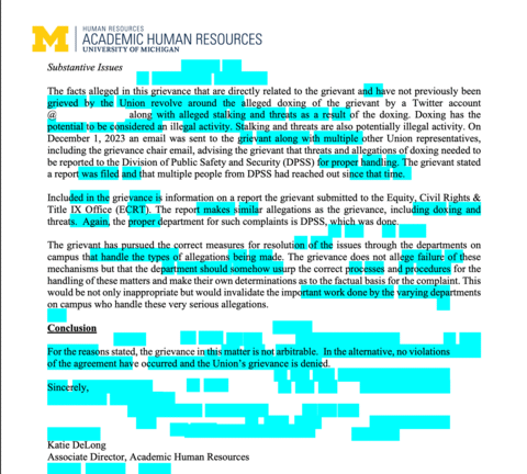 On April 21, 2024, the Graduate Employees’ Organization filed a class action grievance against U-M. It accused then-President Santa Ono of “threatening students” by stating that U-M “will not shy away from protecting the values we hold dear. Those who participate in disruptive activity will be held accountable.”