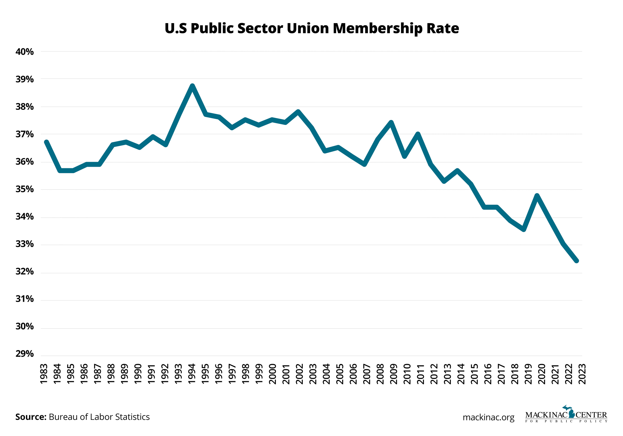From 1979 to 2011, the share of government workers who were members of a union held steady at around 37%. In 2011 a series of states began passing right-to-work laws, giving workers the right to opt out of union membership without losing their jobs. This started a downward trend in union membership. Then in 2018 the U.S. Supreme Court ruled in Janus v. AFSCME that all public sector workers nationwide had right-to-work status.
