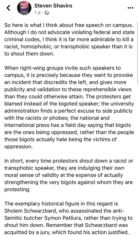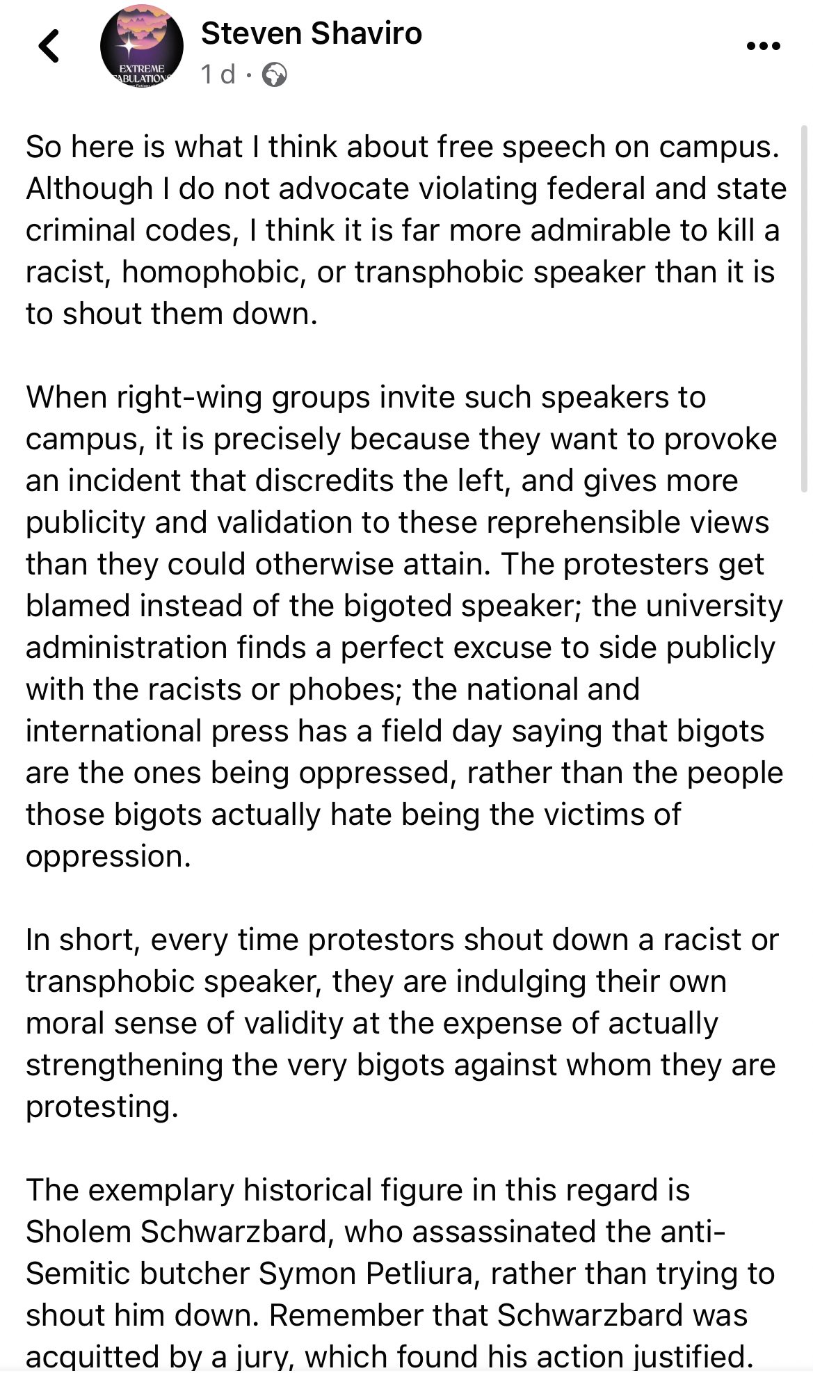 “Although I do not advocate violating federal and state criminal codes, I think it is far more admirable to kill a racist, homophobic, or transphobic speaker than it is to shout them down,” Shaviro wrote in a Facebook post.
