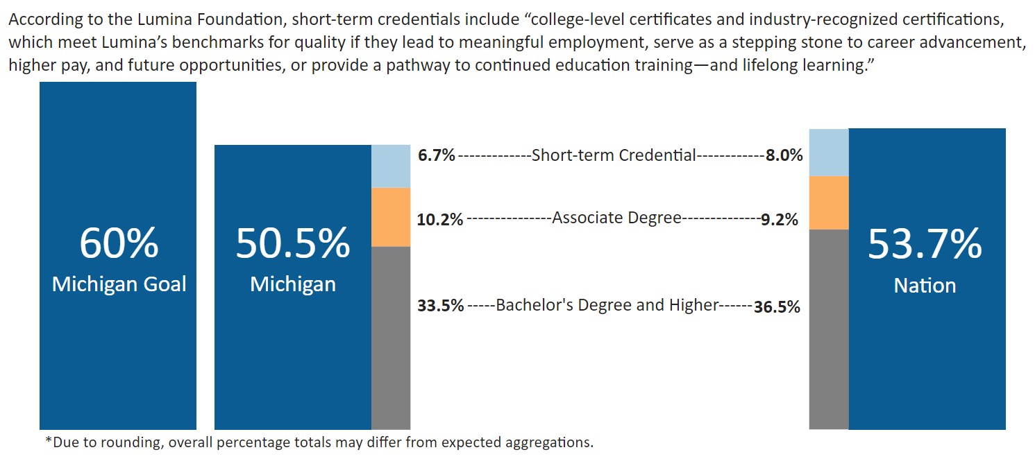 Credentials fall into three groups: a bachelor’s degree or higher, an associate degree, and short-term credential. Michigan lags in bachelor’s degrees and short term credentials relative to America, as shown in the graphic below. But Michigan outpaces America when it comes to associate degrees, with 10.2% of residents holding one compared to 9.2% of Americans.