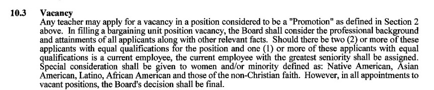 Should there be two (2) or more of these applicants with equal qualifications for the position and one (1) or more of these applicants with equal qualifications is a current employee, the current employee with the greatest seniority shall be assigned. Special consideration shall be given to women and/or minority defined as: Native American, Asian American, Latino, African American and those of the non-Christian faith. However, in all appointments to vacant positions, the Board's decision shall be final.