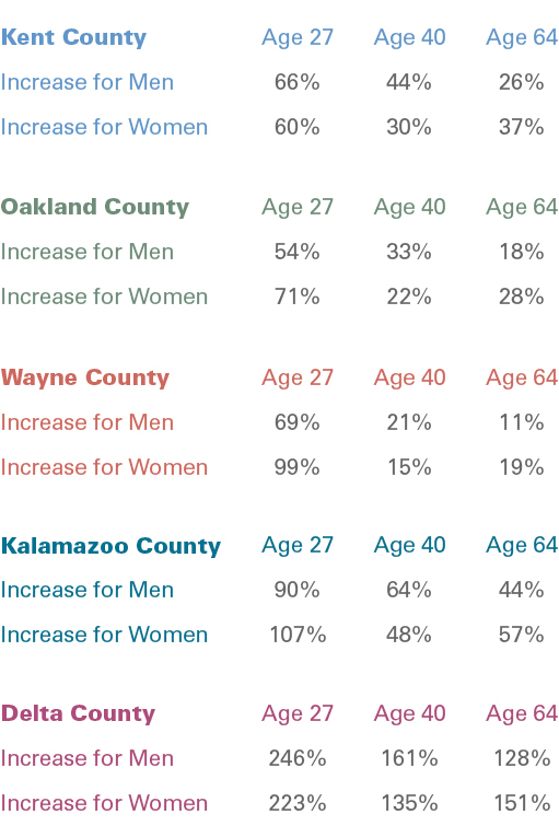 In Michigan, statewide average rates for men ages 27, 40 and 64 rose 107 percent, 73 percent and 52 percent, respectively. For women of the same ages, statewide average rates rose 119 percent, 57 percent and 66 percent, respectively.