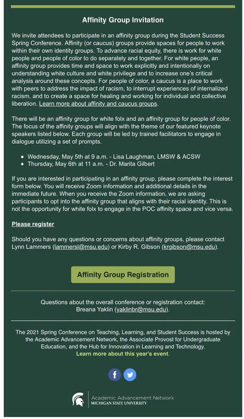 MSU distributed a document called the Affinity Group Invitation for its Student Success Spring Conference. The invitation read, “There will be an affinity group for white folx and an affinity group for people of color.”
