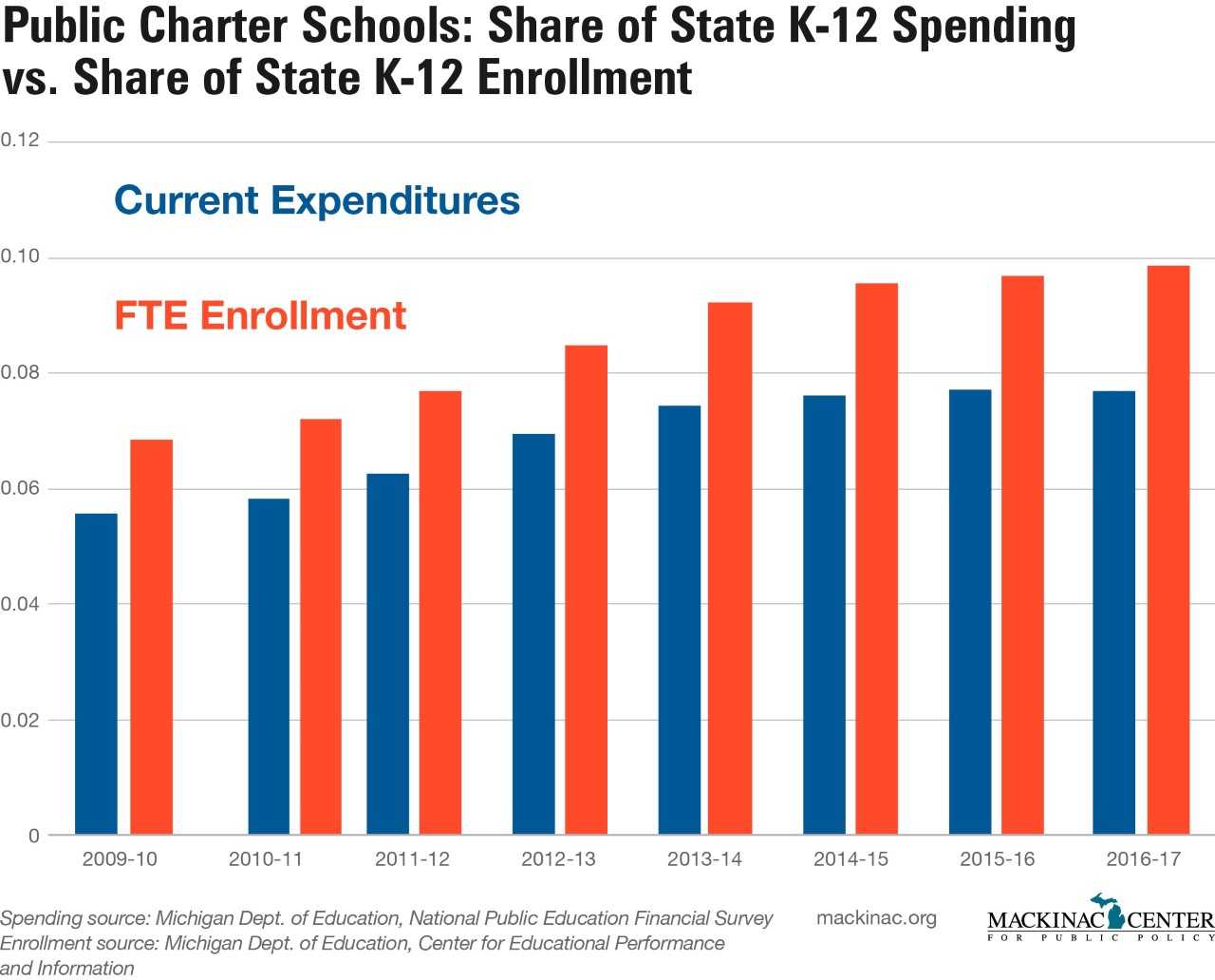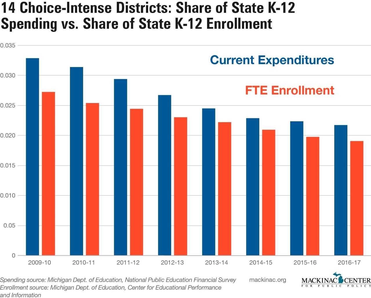 But consider this: In 2010 the 14 districts spent over 20 percent more than what their share of student enrollment would suggest. They served 2.7 percent of Michigan's K-12 public school students, but spent about 3.3 percent of Michigan's K-12 public dollars. Seven years later, these districts still spend nearly 14 percent above the state average.