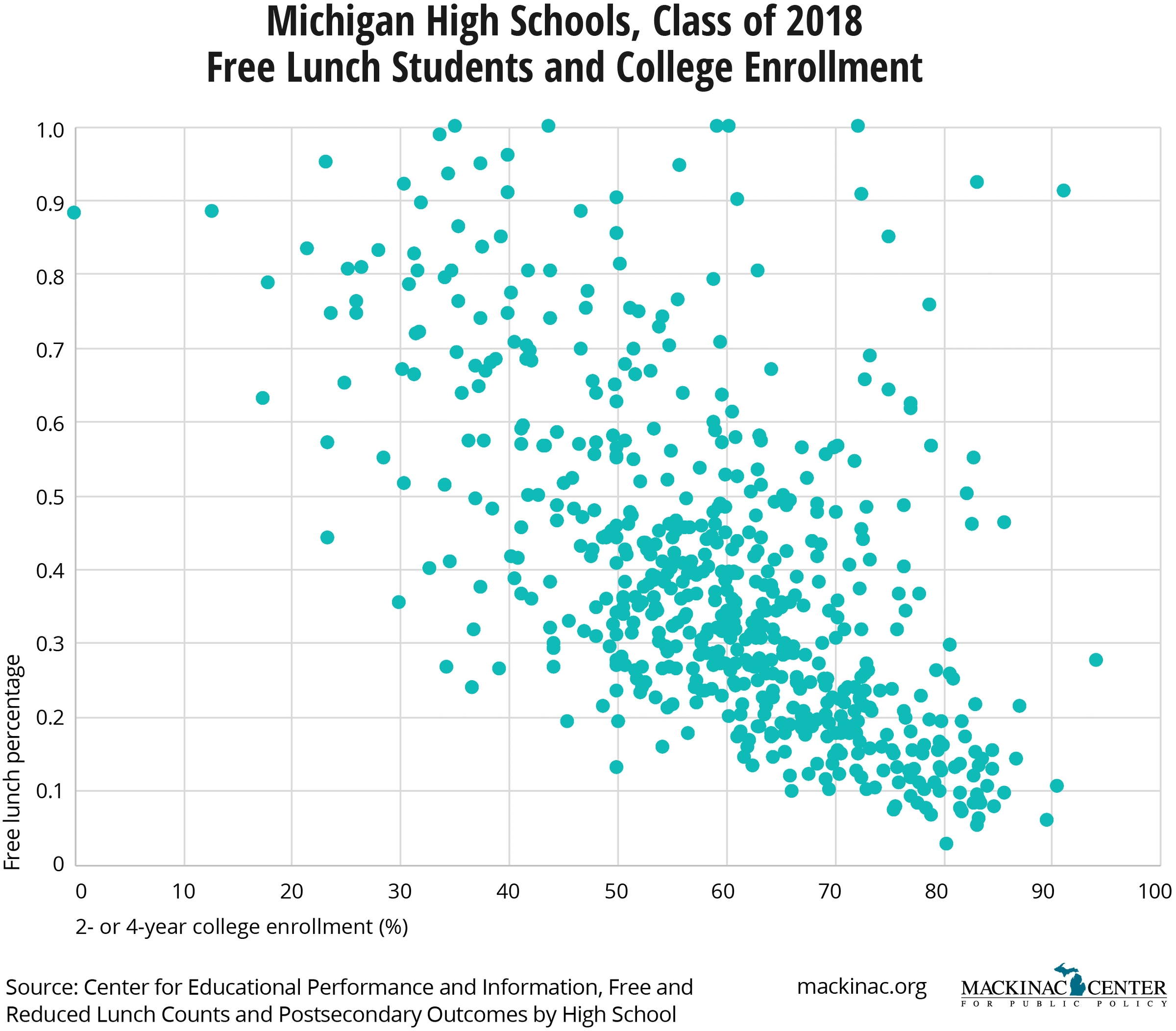 The average college enrollment rate across all high schools in Michigan is just over 59%. From high schools with 60% or more low-income students, less than 45% of graduates enroll in college. Among high schools where less than 40% of students are economically disadvantaged, the college enrollment rate is 65%. However, these averages do not tell the entire story of a school’s quality. As seen above, there are schools with poorer populations whose students attend college at higher rates, as well as those with fewer poor students whose college enrollment rate is lower than similarly situated schools.