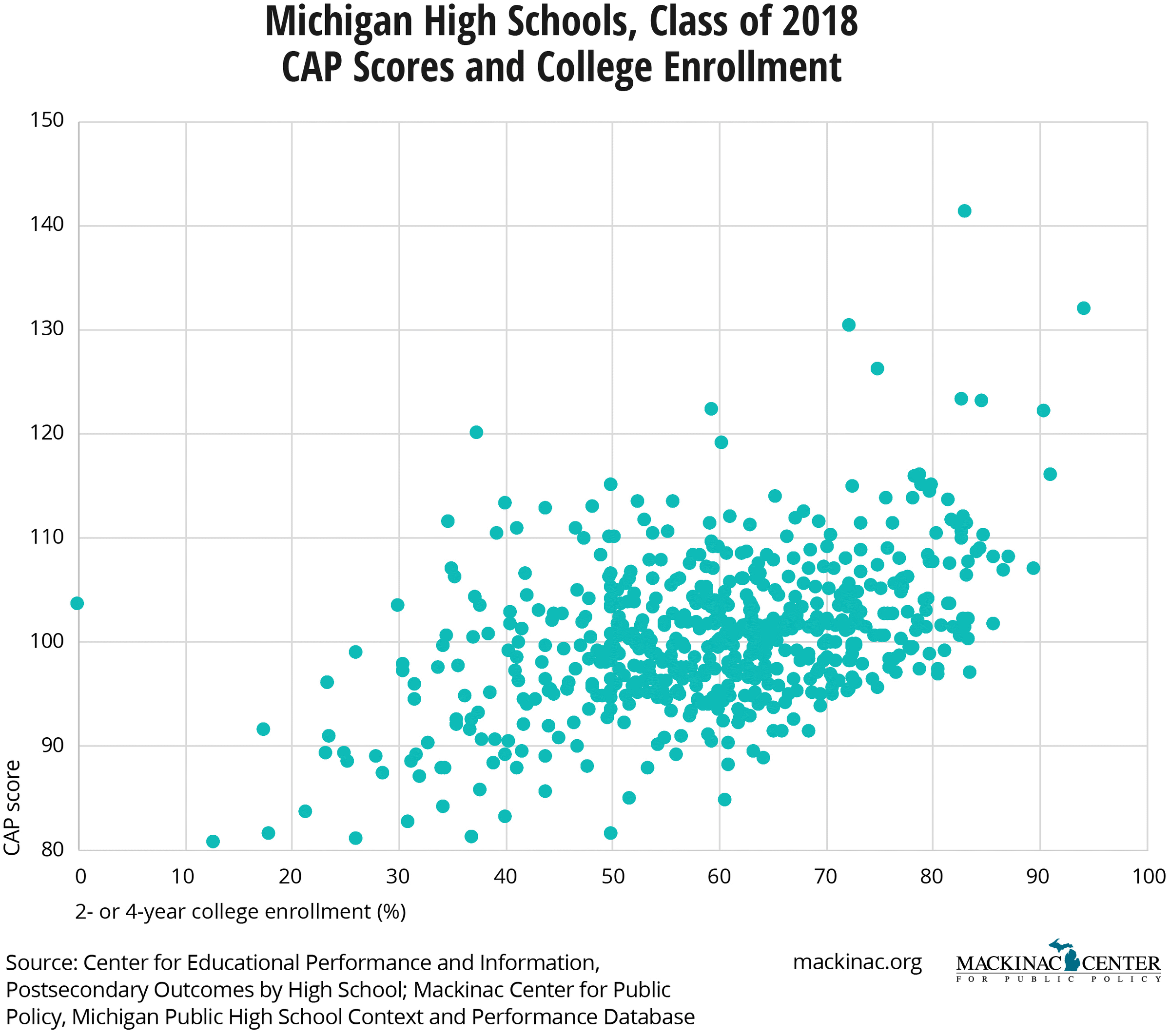 If CAP Scores are helpful in gauging how well a school prepares its students for opportunities after high school, higher CAP Scores should also be associated with more students enrolling in college. That is indeed what we see:
