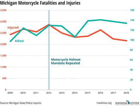 The Michigan State Police collect and assemble state crash and injury reports. Its data shows that before the helmet mandate was repealed in 2012, a total of 109 people died in motorcycle crashes in Michigan. In 2018, the number of fatalities was 134.