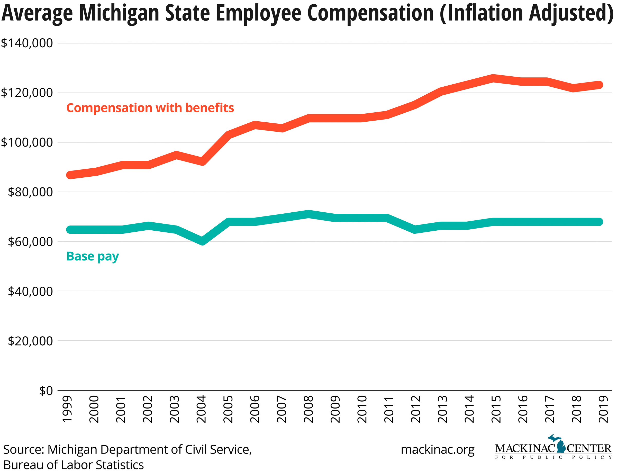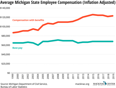 The average cost of compensation other than salary (health care insurance, retirement, retiree health care, Social Security, Medicare, etc.) was $54,845 per employee in 2019. Direct compensation (that is workers’ paychecks) that year averaged $68,114. After adjusting for inflation, direct compensation for state workers has been relatively flat for two decades, according to the Mackinac Center’s director of fiscal policy James Hohman.