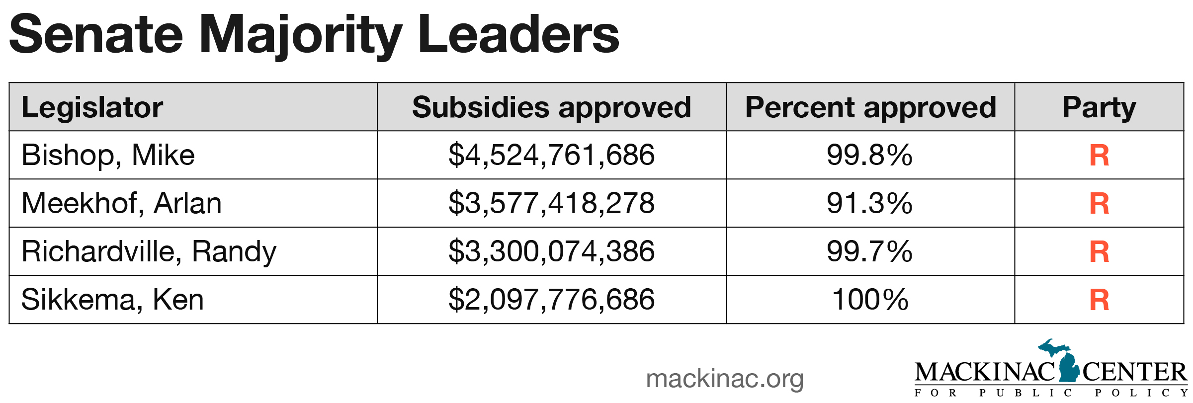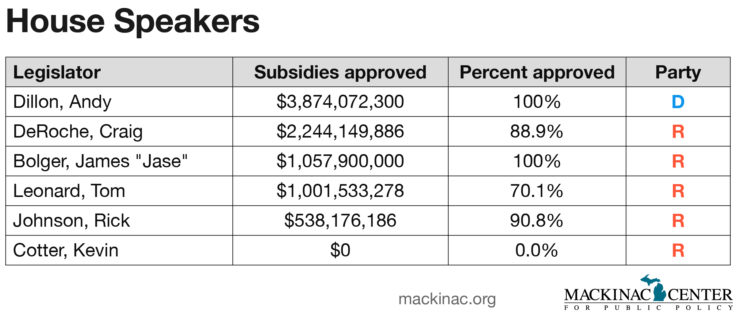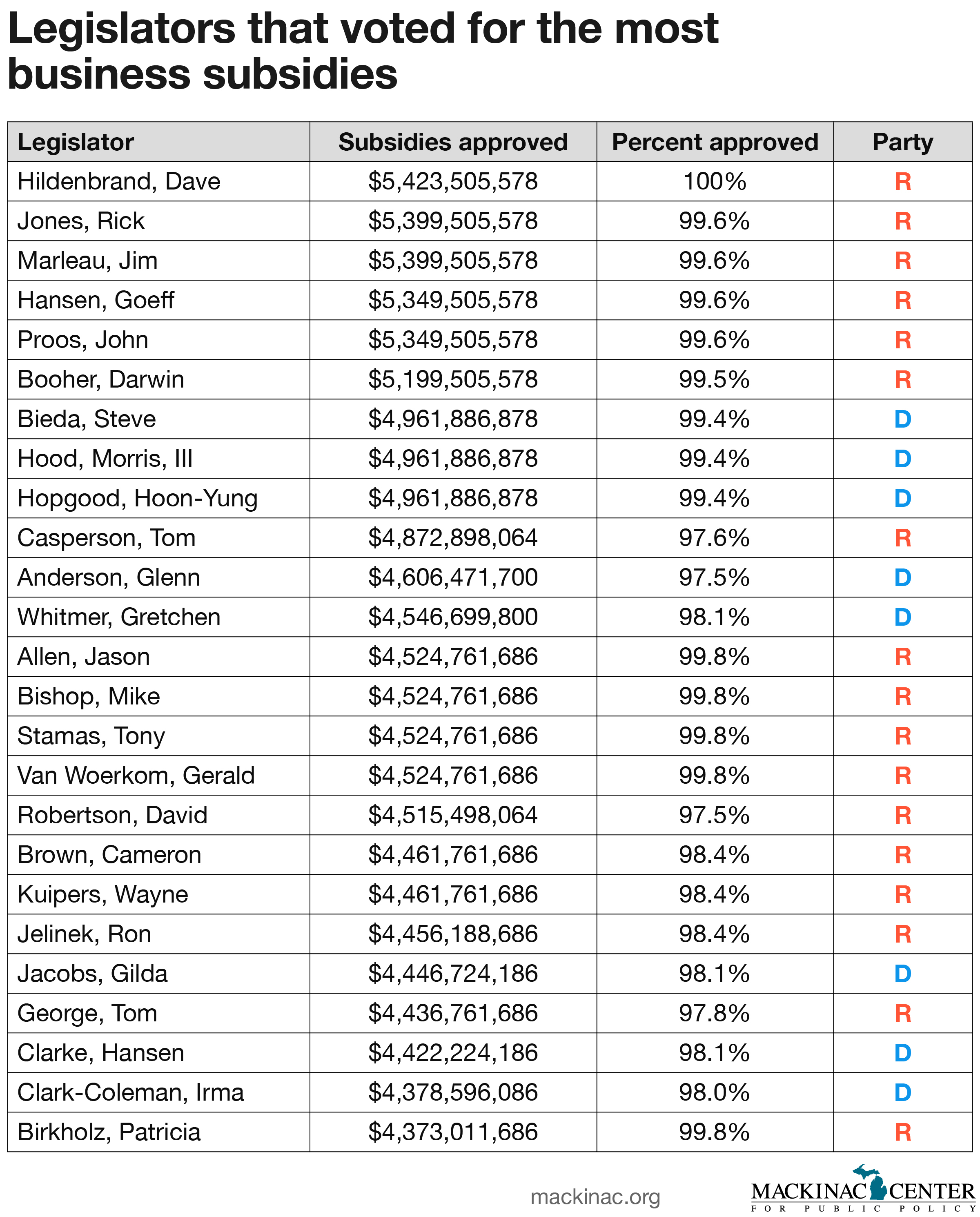 The scorecard covers two years at the end of the final Engler administration, the entirety of the Granholm administration, and all but the final year of the Snyder administration. Gov. Jennifer Granholm agreed with the Legislature to approve $12.6 billion in business subsidies. Gov. Rick Snyder has agreed to $2.5 billion in subsidies so far.