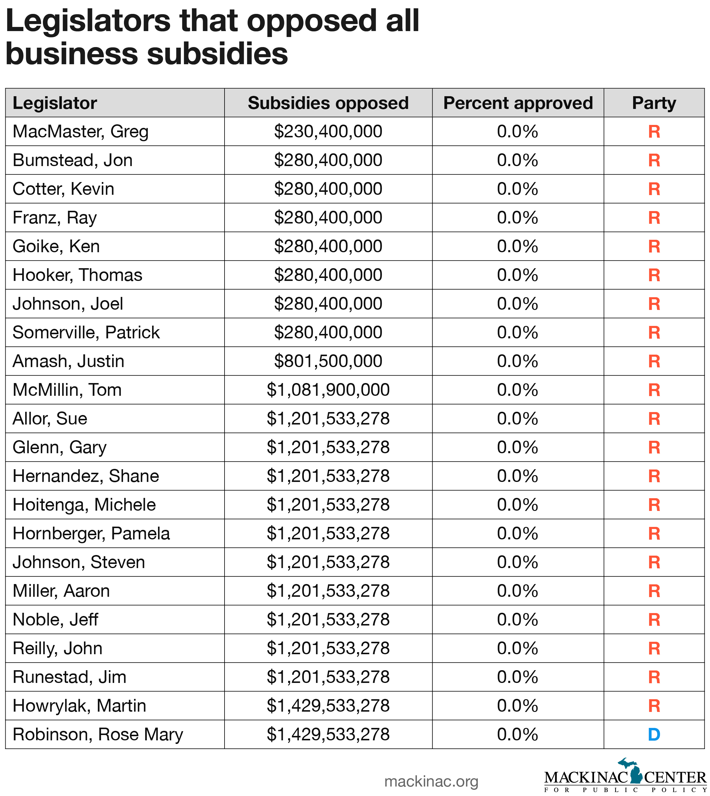 In 17 years, 22 lawmakers opposed every business subsidy the Legislature approved while they served. Only one was a Democrat (Rep. Rose Mary Robinson of Detroit).
