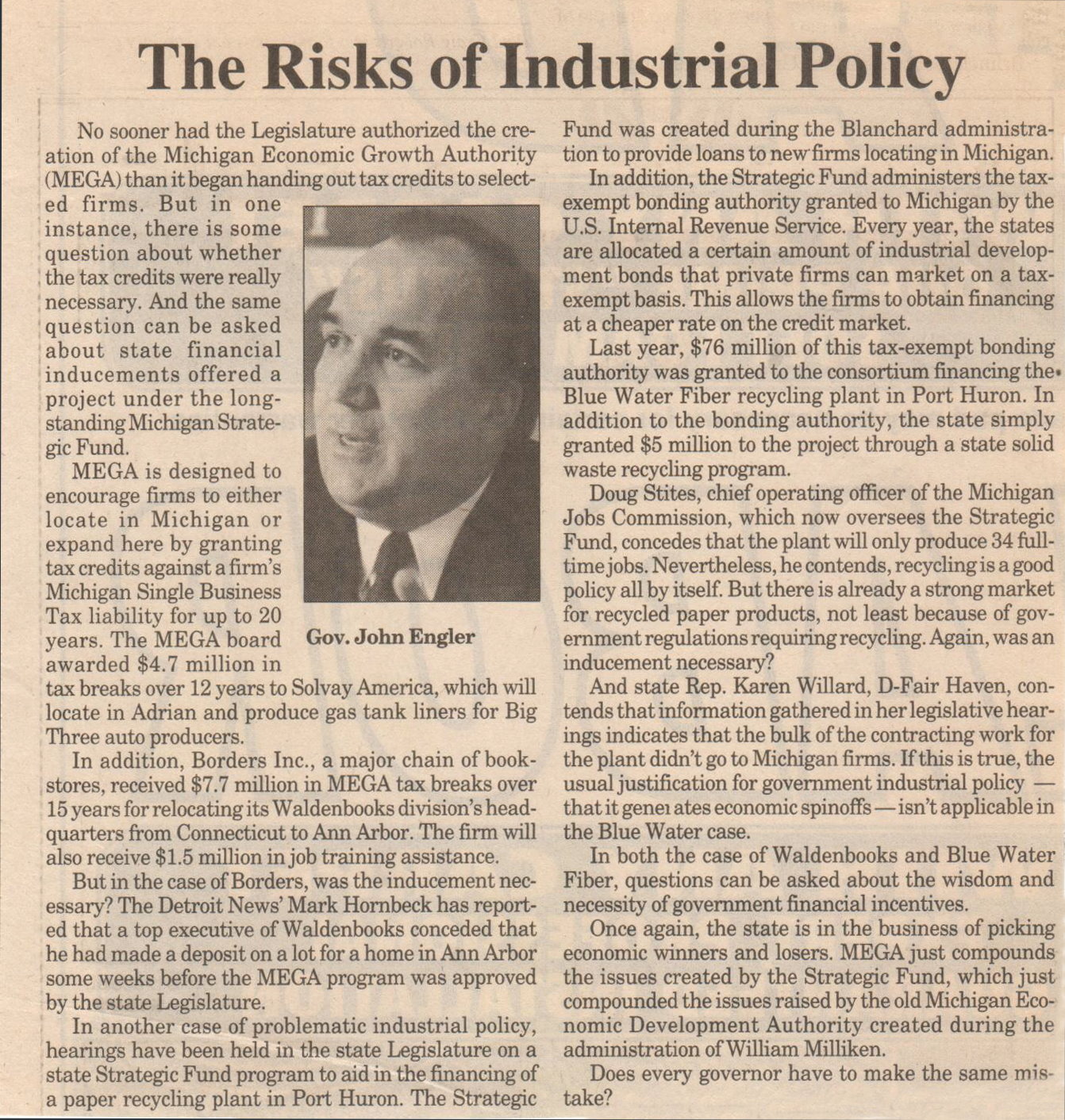 I was reminded of this while doing research for the Mackinac Center’s newest study on state incentive programs. I stumbled across a 1995 editorial from The Detroit News titled “The Risks of Industrial Policy.” The editorial raised concerns about corporate handouts in general, but it focused on three deals — with Blue Water Fiber, Borders (Walden Books, Corp.) and Solvay Automotive — that would allegedly create new jobs for Michiganders.