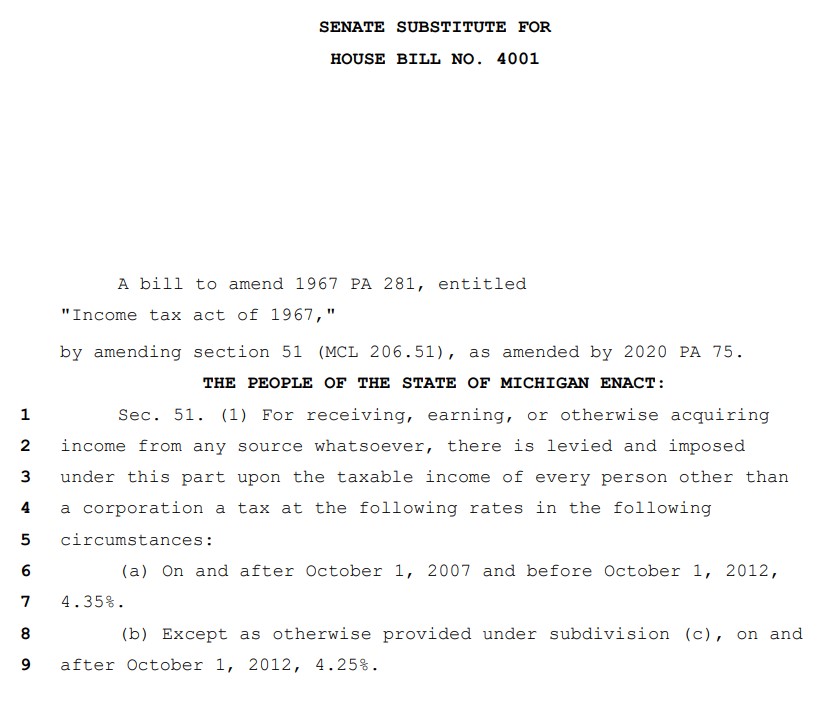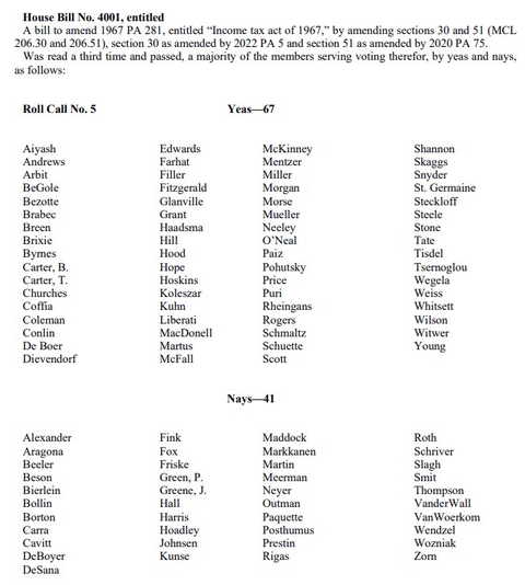 When House Bill 4001 was taken up by the Senate, it only passed 20-18, along party lines. The House version, passed earlier in a much different form, passed 67-41. The earlier version passed by the House dealt only with repealing the pension tax.