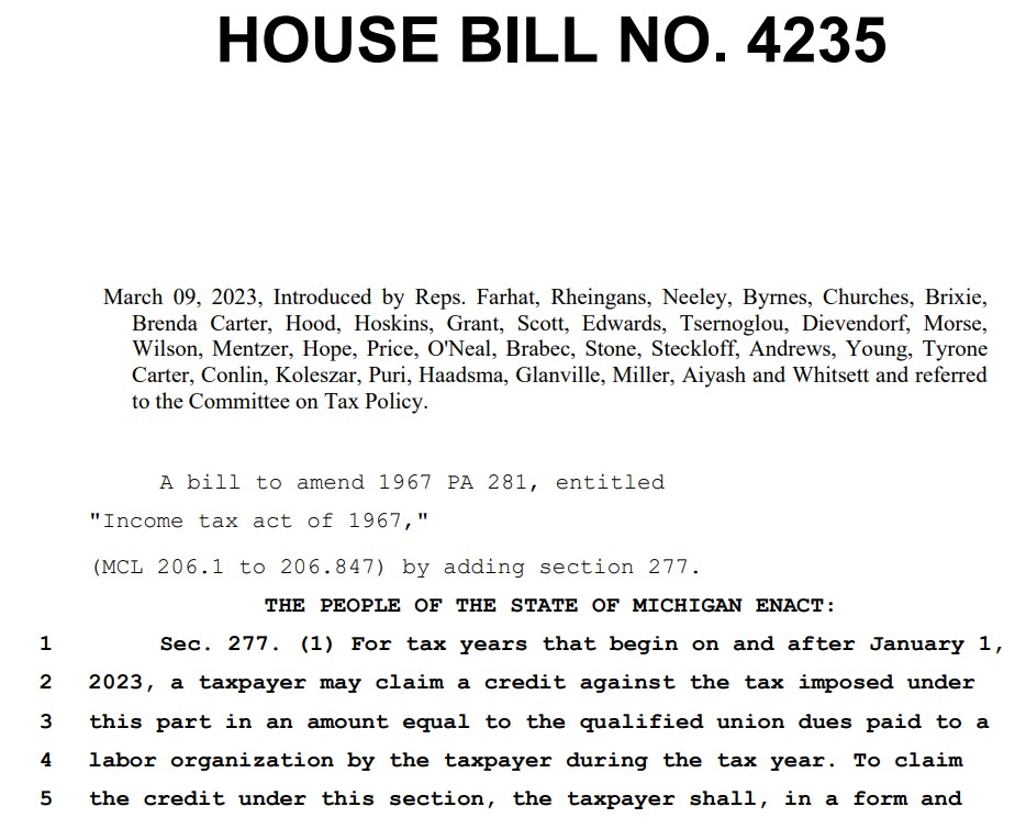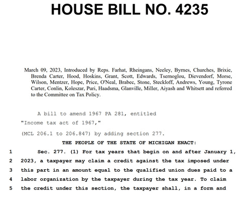 Rep. Alabas Farhat, D-Dearborn, submitted House Bill 4235. The two-page bill would make union dues refundable on Michigan income tax forms.