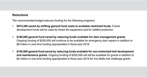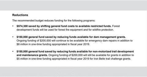 The governor’s first budget proposal would have reduced the amount placed in a dam repair fund compared to the previous year, when $350,000 had been allocated for dam repair grants. Whitmer wanted to reduce that to $200,000. The Legislature rejected the cut, and the dam fund received $350,000 for the current fiscal year budget.