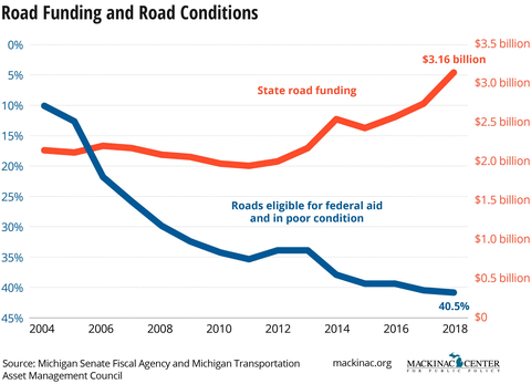 “Whitmer is not proposing selling bonds as part of the plan. Instead, she is looking at adding to the state's 26.3-cent-a-gallon gas tax without taking off the existing state sales tax on gasoline. Such an increase would raise roughly $2.5 billion for the roads.”