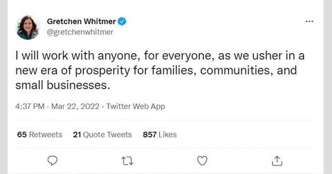 Gov. Gretchen Whitmer tweeted March 22: “I will work with anyone, for everyone, as we usher in a new era of prosperity for families, communities, and small businesses.”