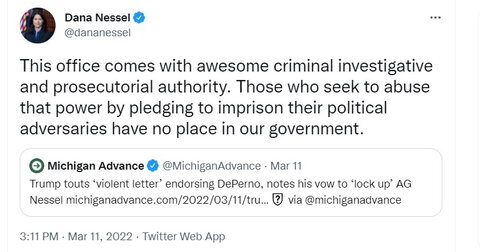 Michigan Attorney General Dana Nessel posted March 11 on Twitter to mention an article about Donald Trump supporting her political opponent, Matthew DePerno, at a fundraiser. DePerno has said he would prosecute Nessel if elected.